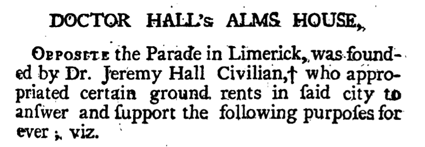 28 A full transcript of Hall's will also survives; it provided for the foundation of almshouses and schools both in Limerick and in Boothtown, Yorkshire. This document, containing extensive details relating to his building plans, his books, legacies to Trinity College, Lord Powerscourt and the earls of Orrery, Donegall and Stafford, and various other matters, would have taken some time to compose.